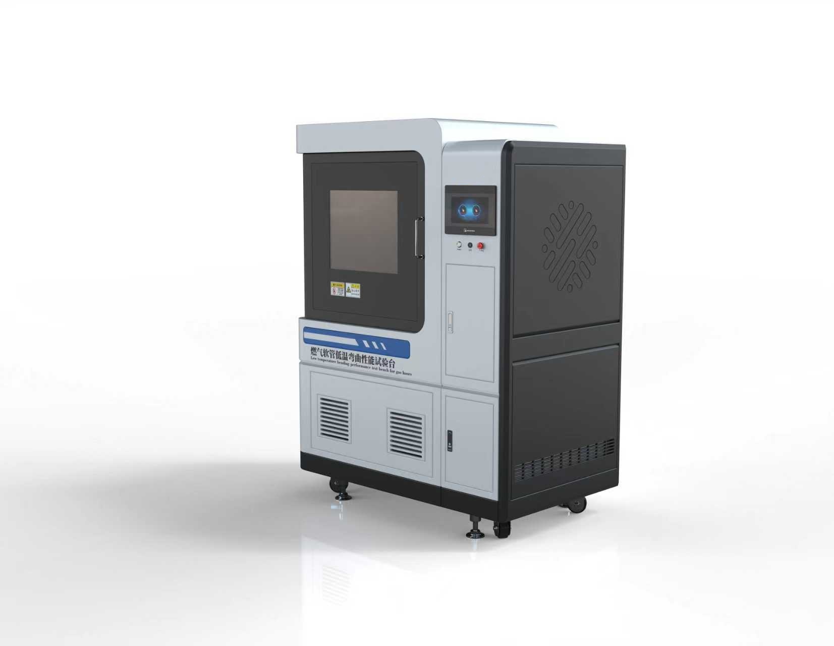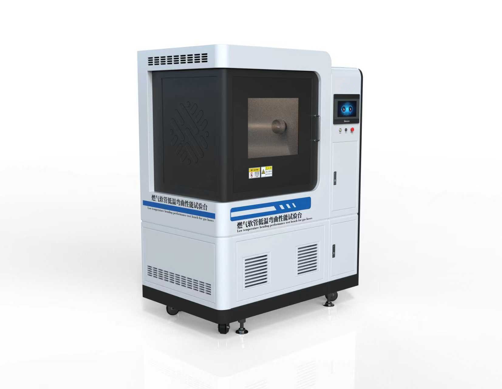 燃气软管低温弯曲性能试验台是专门用于评估燃气软管在低温环境下承受弯曲载荷能力的测试设备。其核心功能是模拟燃气软管在实际使用中可能遇到的低温弯曲工况(如寒冷地区或低温储存环境),通过精确控制温度、弯曲角度、速度等参数,检测软管在低温条件下的柔韧性、抗裂性及结构完整性,确保其符合安全标准。
