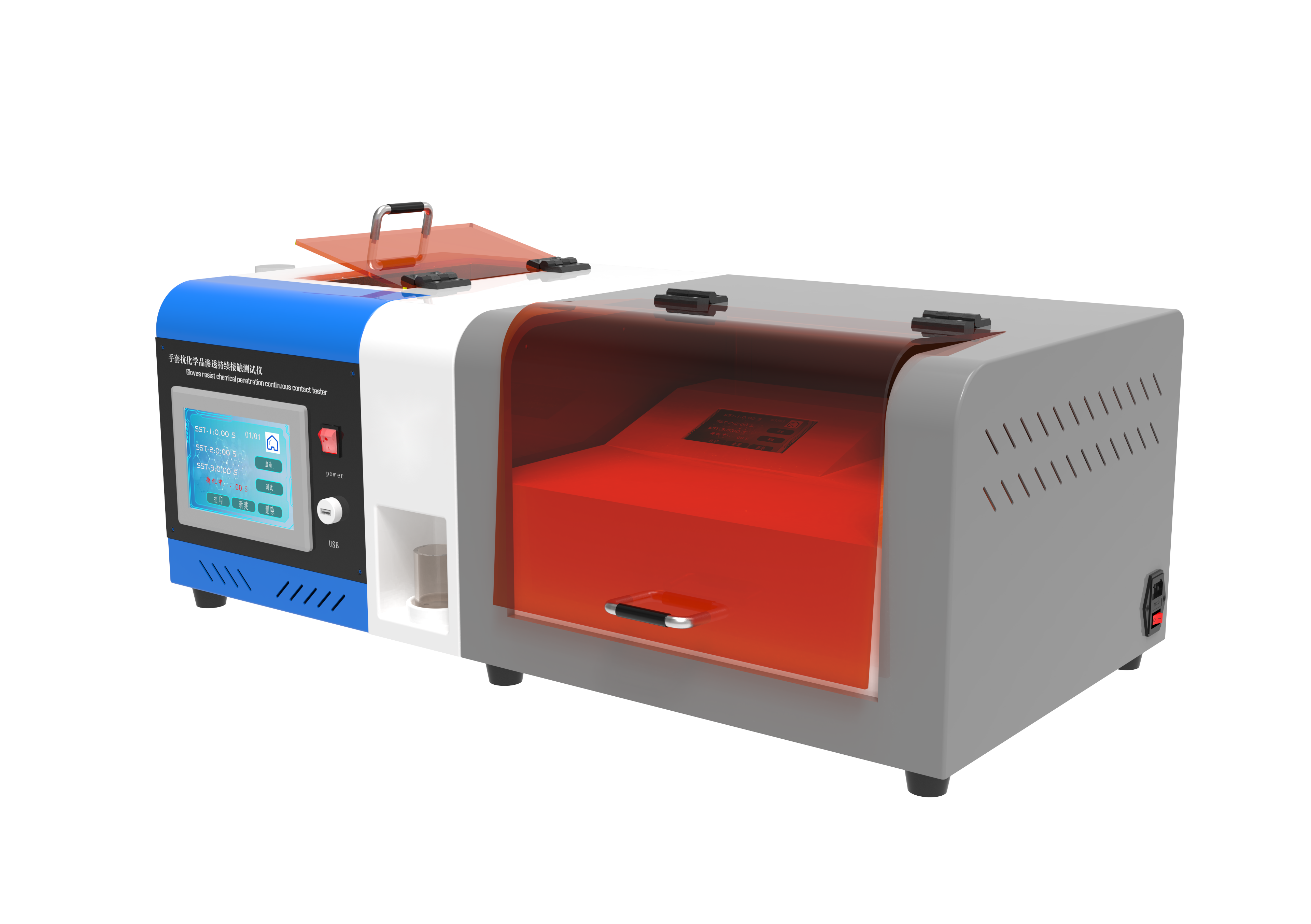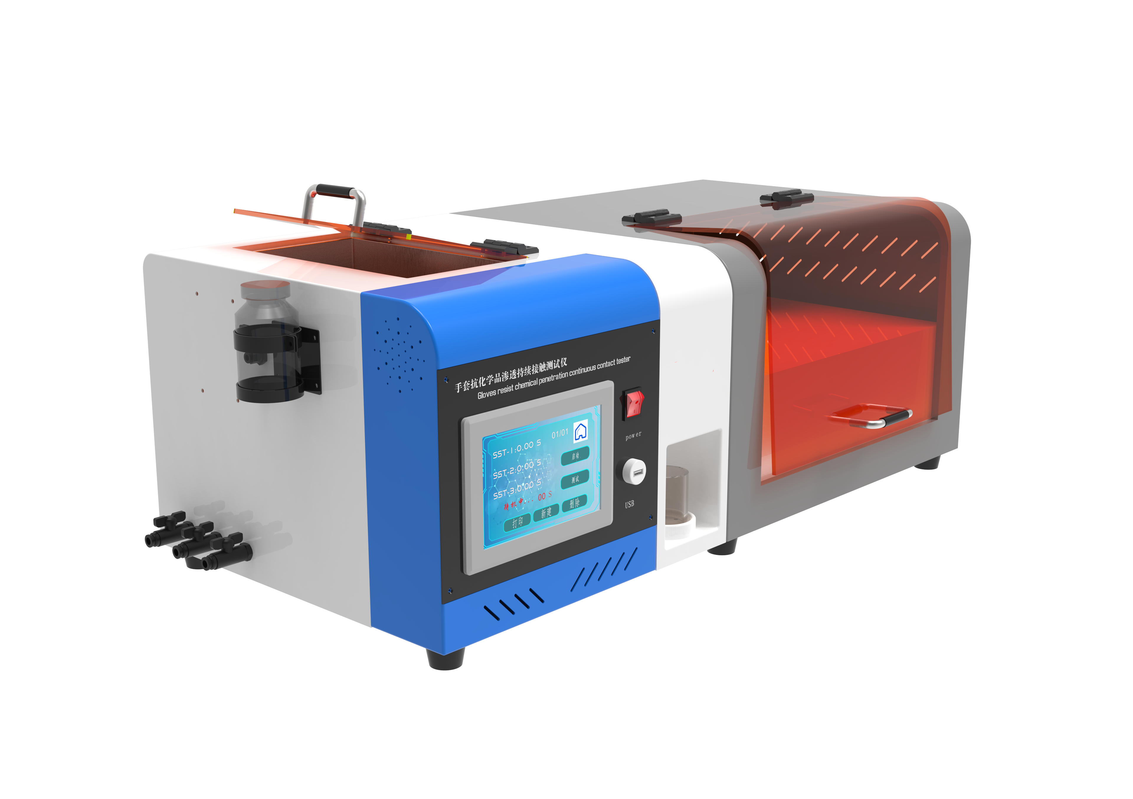 yi用手套抗化学品渗透持续接触测试仪是用于评估手套材料在持续接触液体化学品时,阻隔化学物质渗透能力的专业设备。其核心功能是通过模拟真实使用场景,量化手套材料的防护性能,为医疗、工业等领域提供安全防护依据。