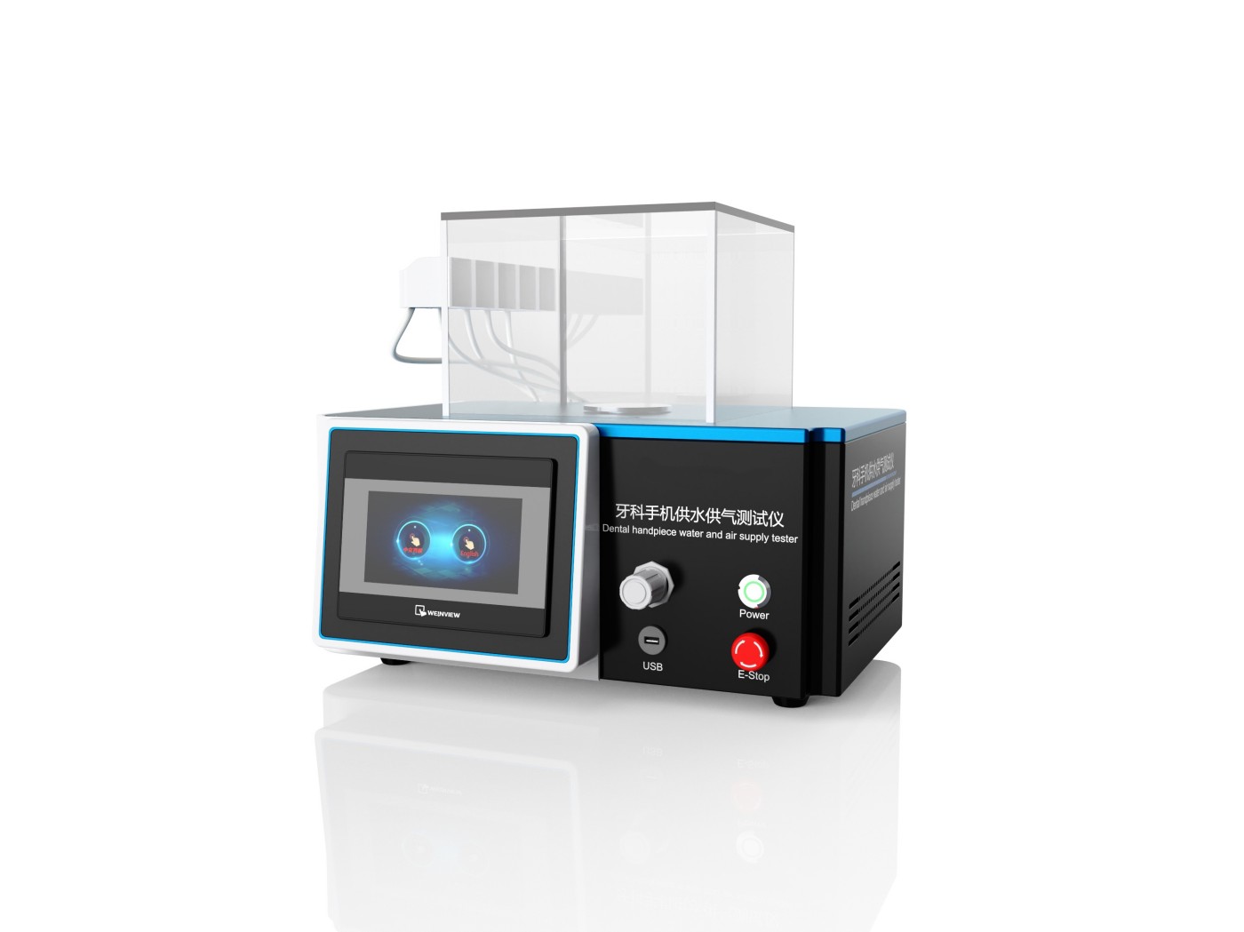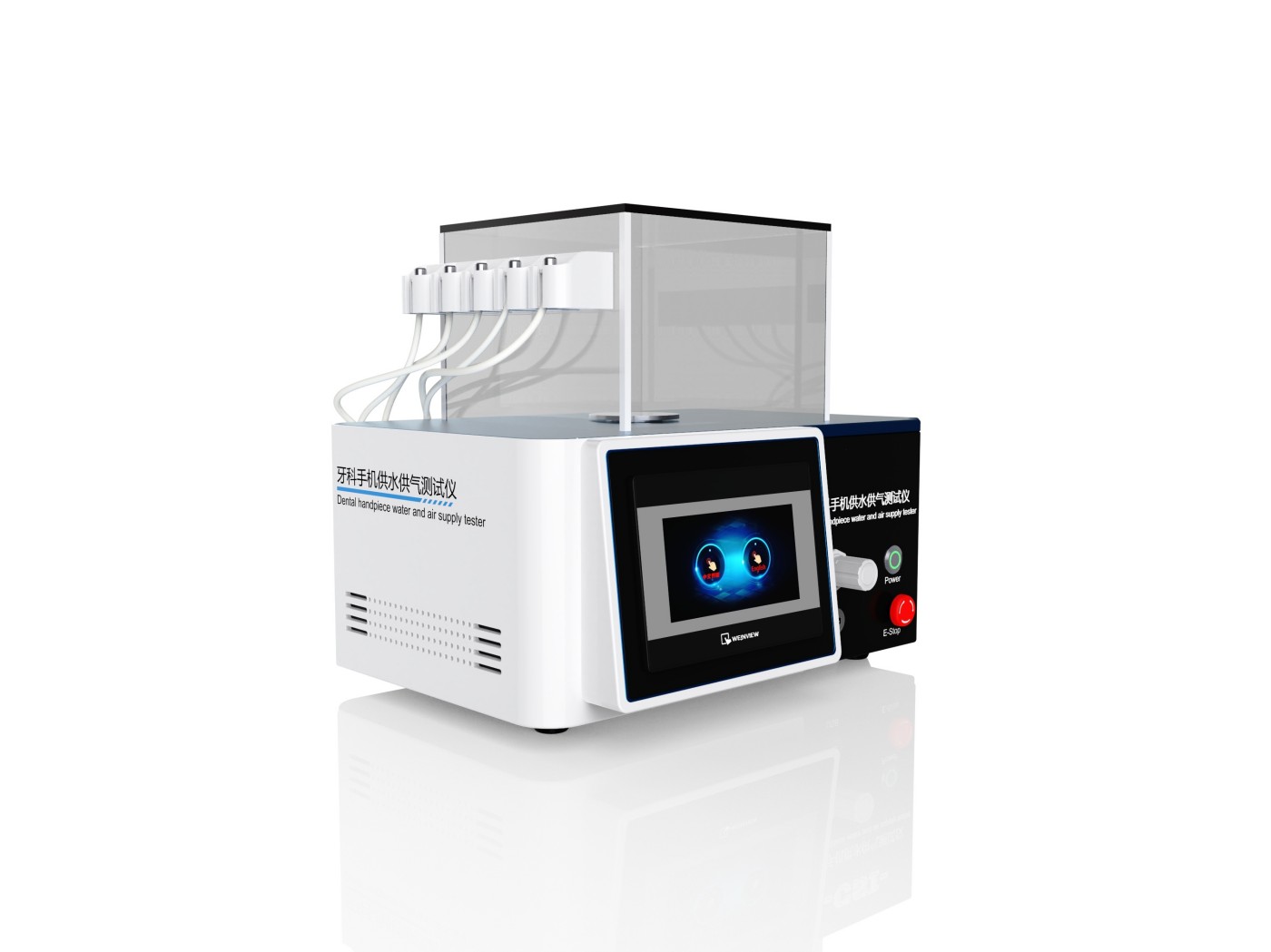 设备通过集成气路、水路系统,模拟牙科综合治疗机的供气、供水环境,为牙科手机提供可调的压力和流量输入。